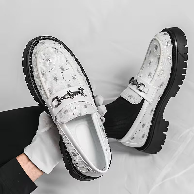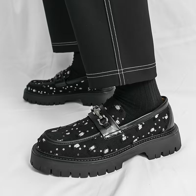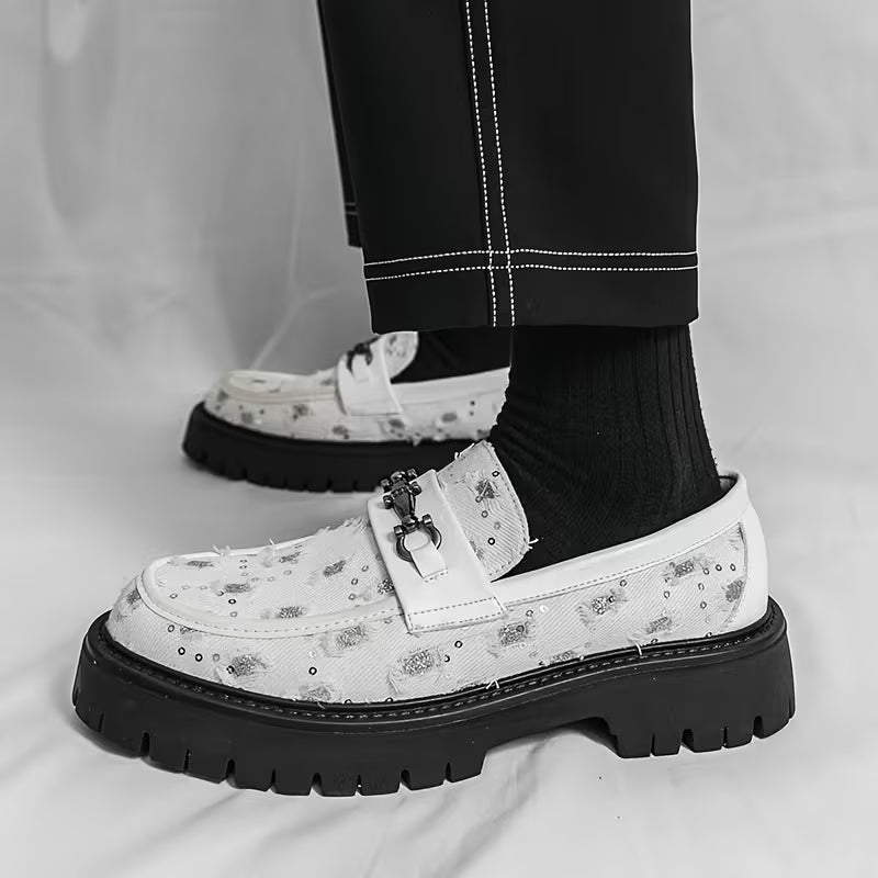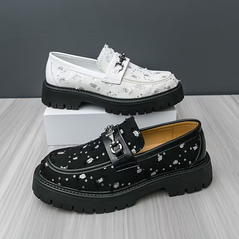 Herren & Damen Slip-On Loafer mit Pailletten-Detail – schwarzes oder weißes Stoffoberteil, PU-Innenausstattung, rutschfeste Gummisohle und runder Zeh. Perfekt für Business-Casual Outfits, Partys und modische Streetwear. Leicht, bequem und für alle Jahreszeiten geeignet.
