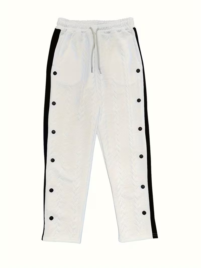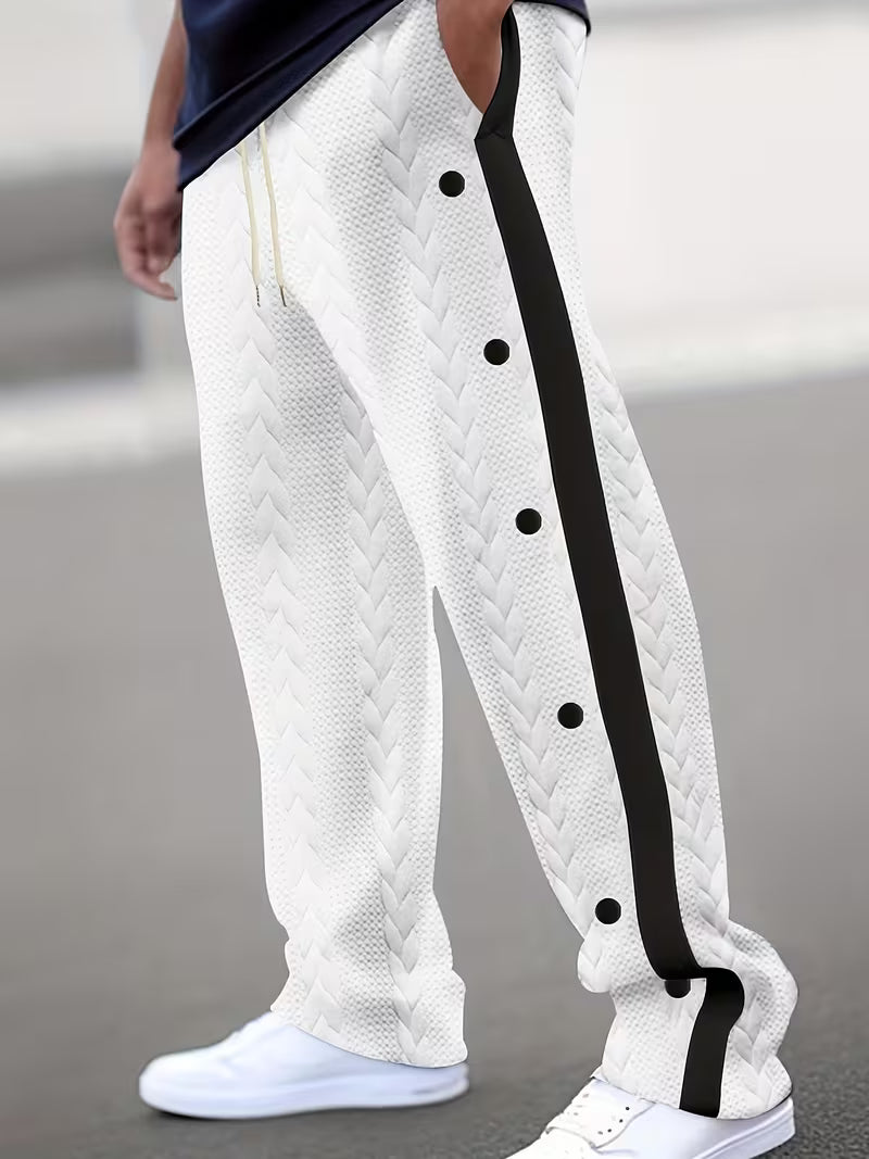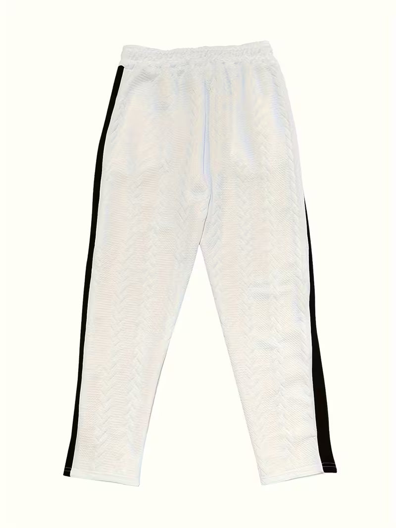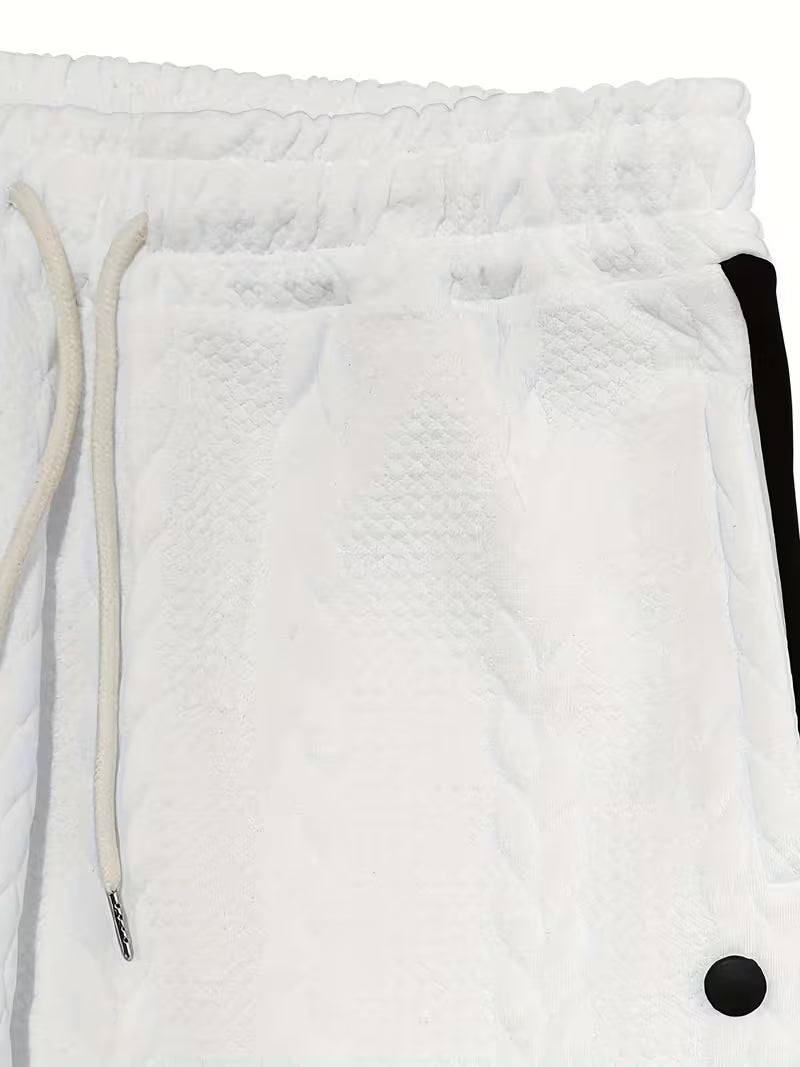 Moderne Herren Jogginghose in Schwarz mit geflochtenem Strukturdesign, weißem Kordelzug und goldenen Akzenten. Bequeme Regular-Fit All-Season Hose – perfekt für Alltag, Freizeit & Streetstyle.